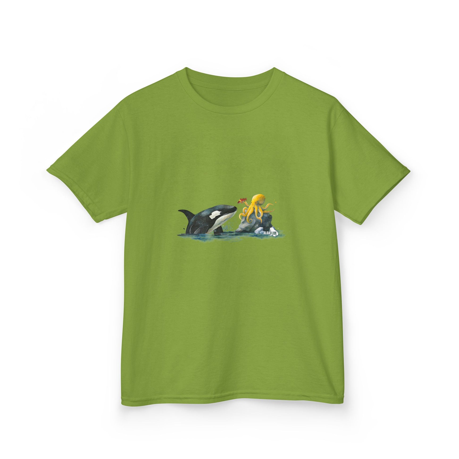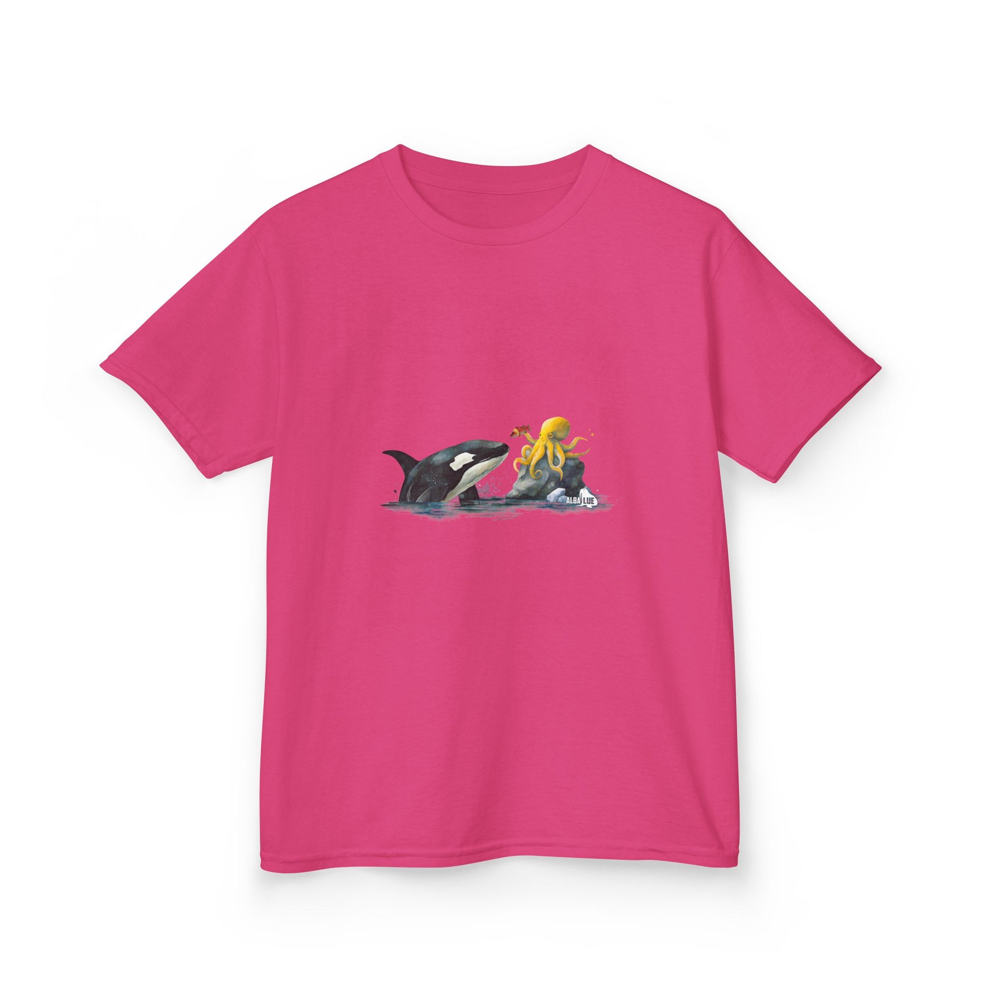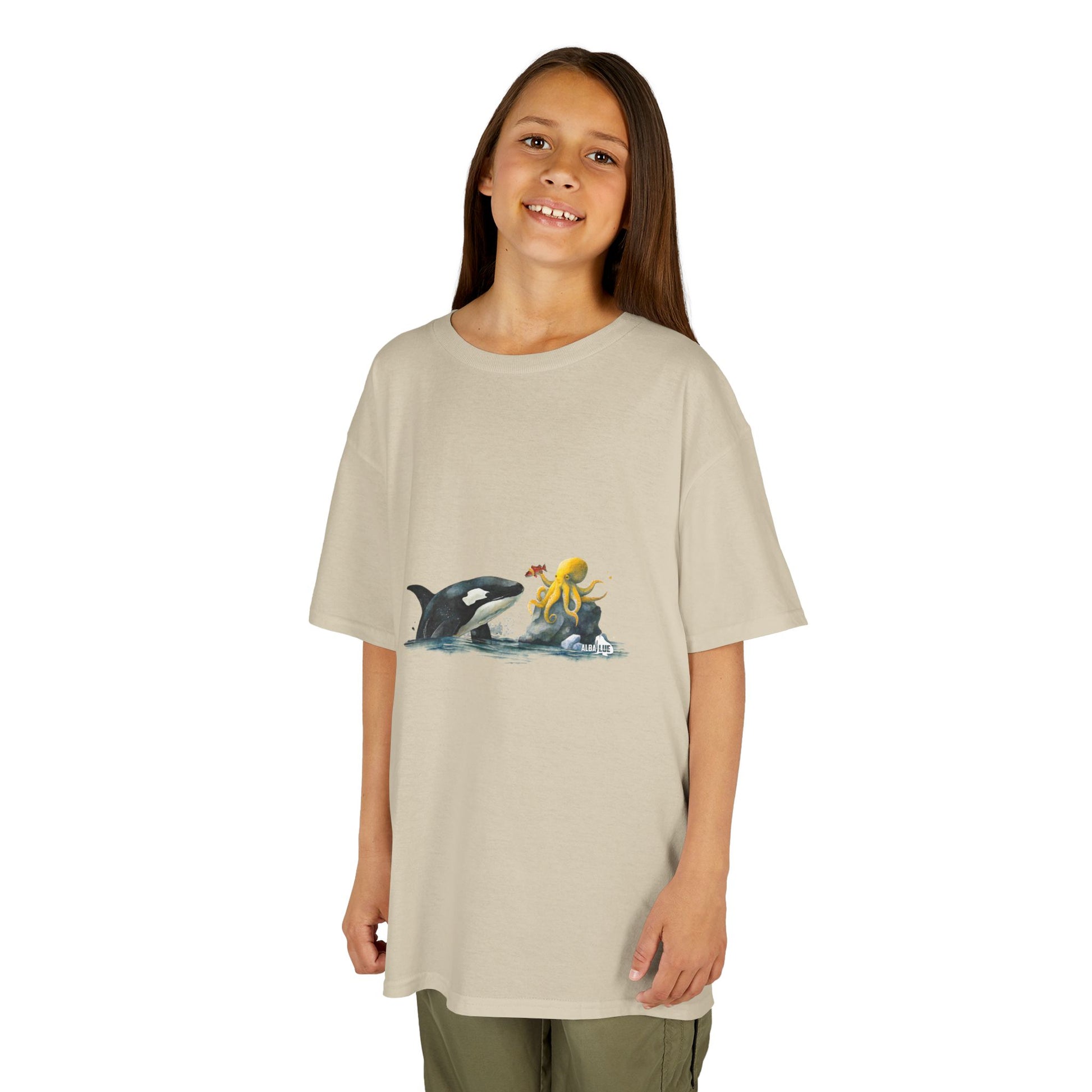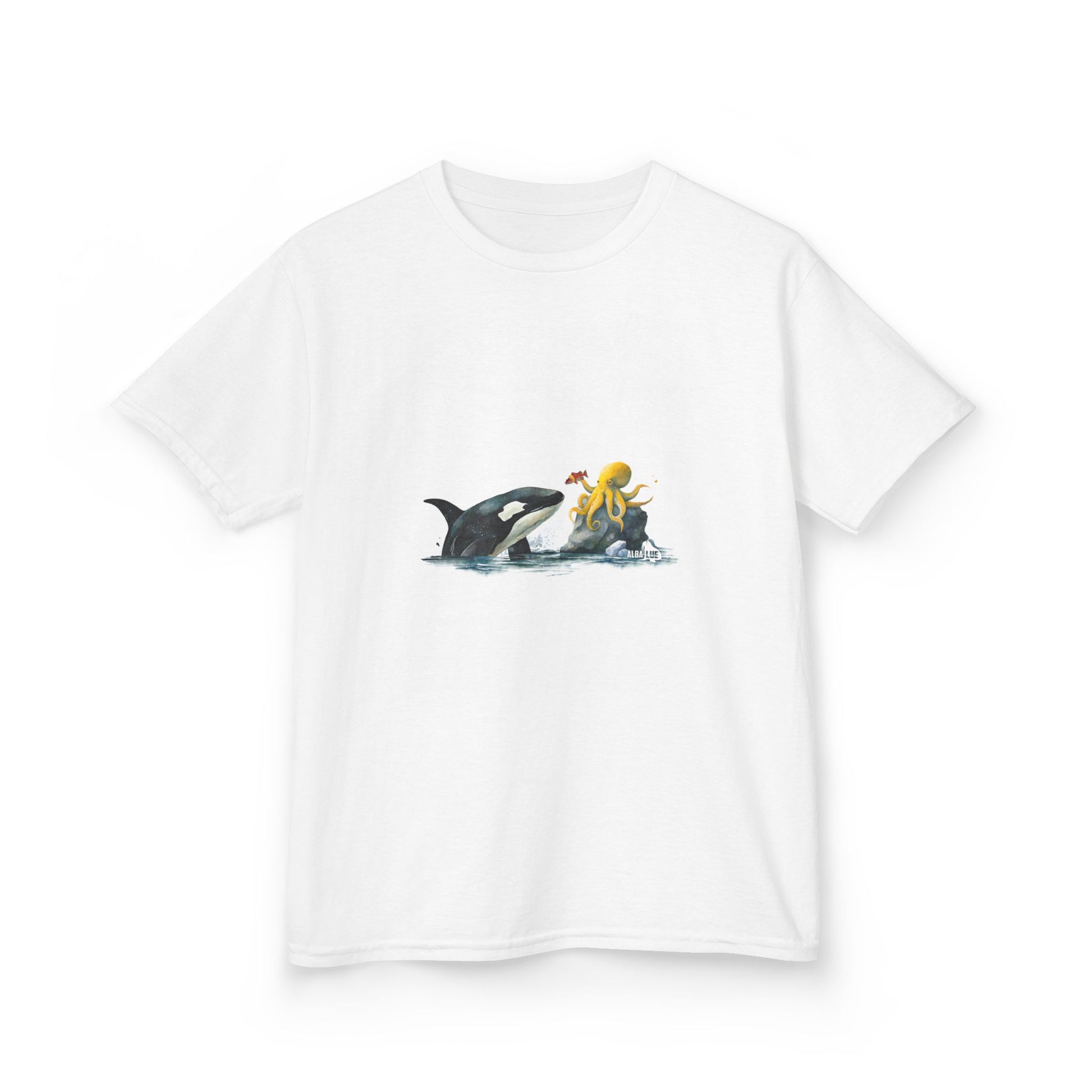 Soft, midweight cotton with a gentle illustration at the center — this kids tee feels like a quiet afternoon by the water. The small, watercolor-style art shows a child in a yellow raincoat kneeling beside a friendly orca, suggesting curiosity, friendship, and small adventures. Lightweight yet durable, the classic crew cut and clean neckline keep the look simple so the illustration stays the focus. It lives in everyday wardrobes: playtime, story hour, rainy-day explorations, or layered under a jacket when the air turns brisk. The shirt’s responsibly sourced cotton and tear-away labels make it comfortable against sensitive skin, while the stitched shoulders and ribbed collar help it hold shape through frequent washes. If you want a gentle, storybook piece that sparks imagination and quiet moments, this tee brings that feeling to life.