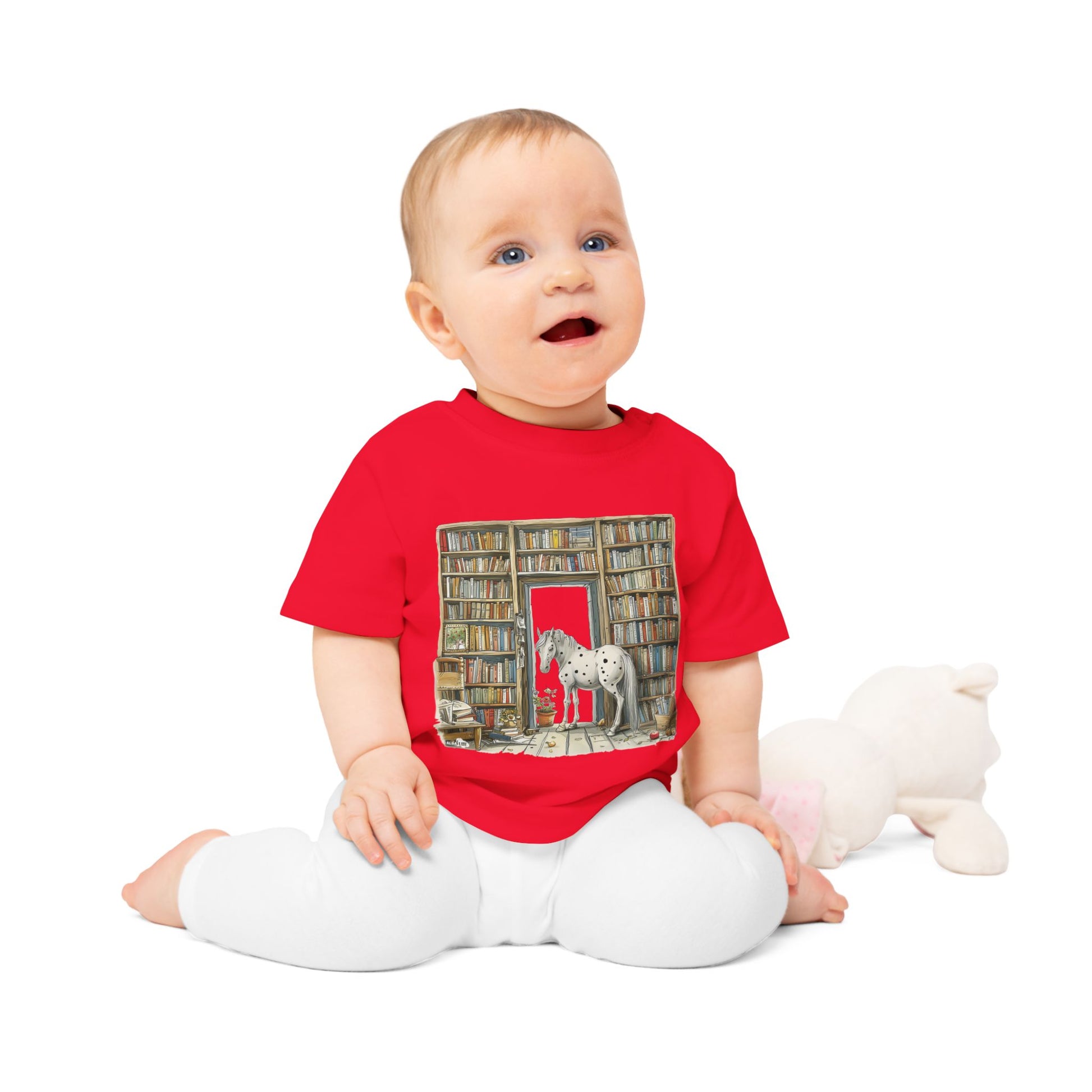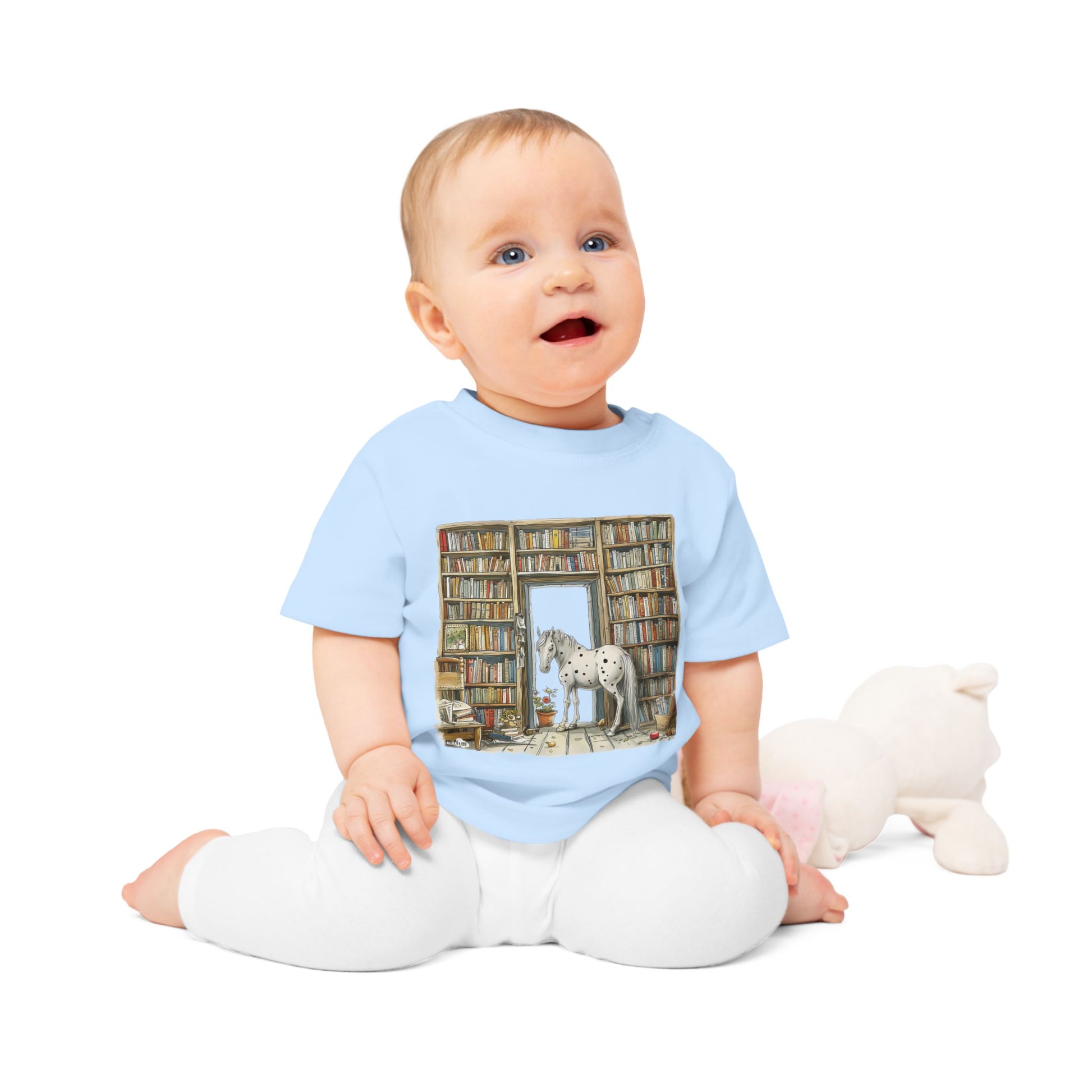 Soft, tiny and full of wonder — this baby tee brings a gentle story to everyday wear. A spotted horse pauses inside a warm home library, surrounded by stacks of books, wooden floors, and quiet sunlight. The illustration feels like a bedtime chapter: curious, calm, and curious about the next page. Slip it on a little one and watch a cozy mood settle in — ready for storytime, slow mornings, or cuddles on the sofa. The shirt’s muted palette and hand-drawn details pair naturally with knitted cardigans, nursery shelves, and a parent who loves books and quiet adventures.