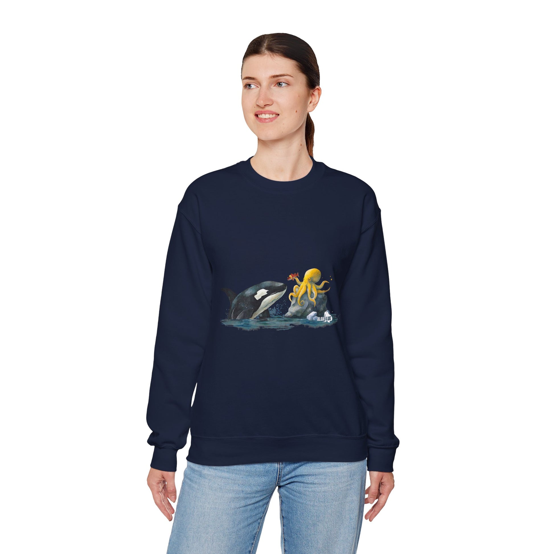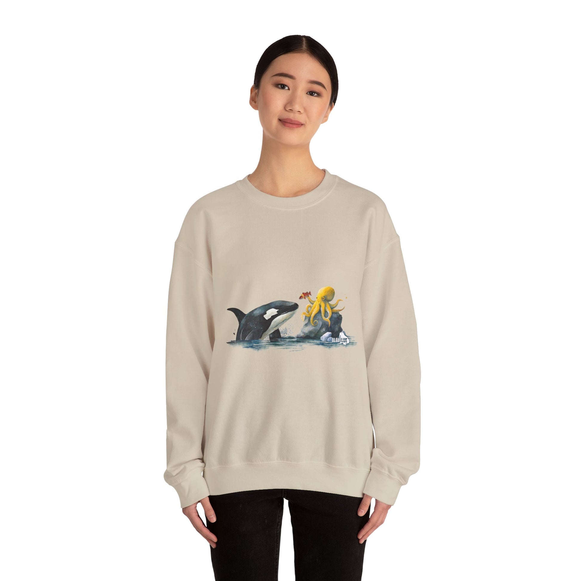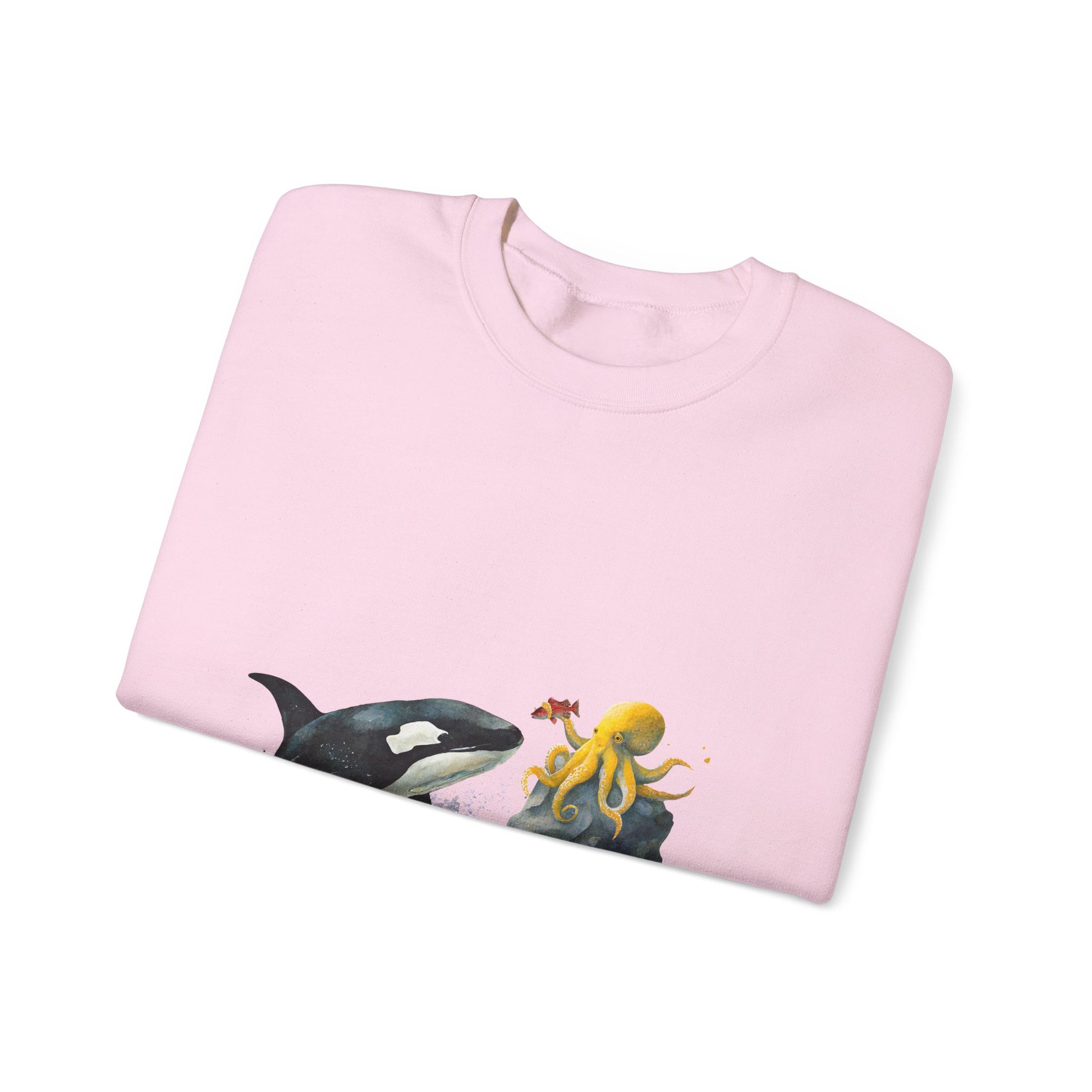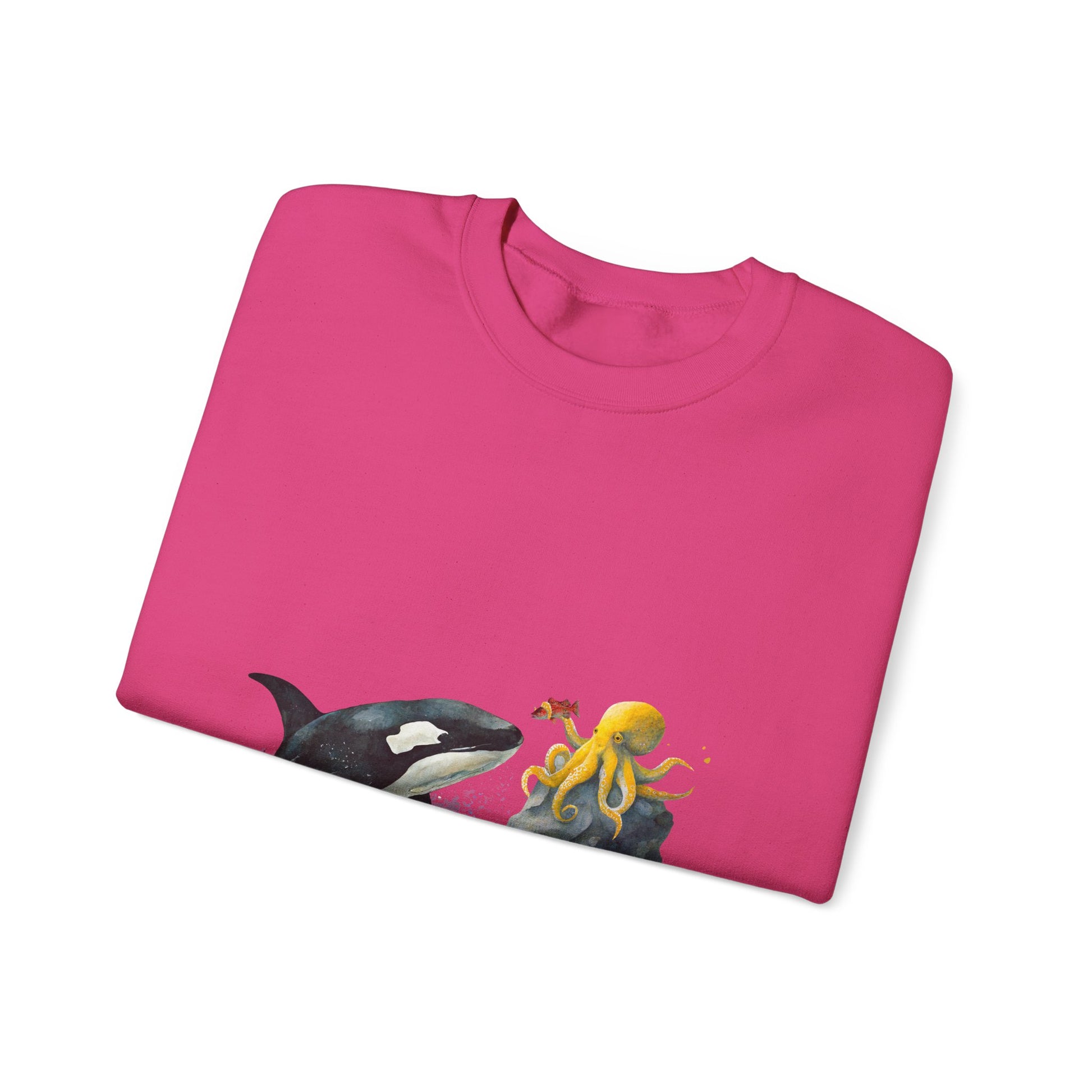 This Sweatshirt featuring an orca playing with an octopus design exudes a playful and whimsical vibe. Perfect for animal lovers, marine life enthusiasts, and those who appreciate unique and eye-catching designs. Ideal for casual wear, lounging at home, or as a statement piece during marine-themed events or animal conservation awareness days.