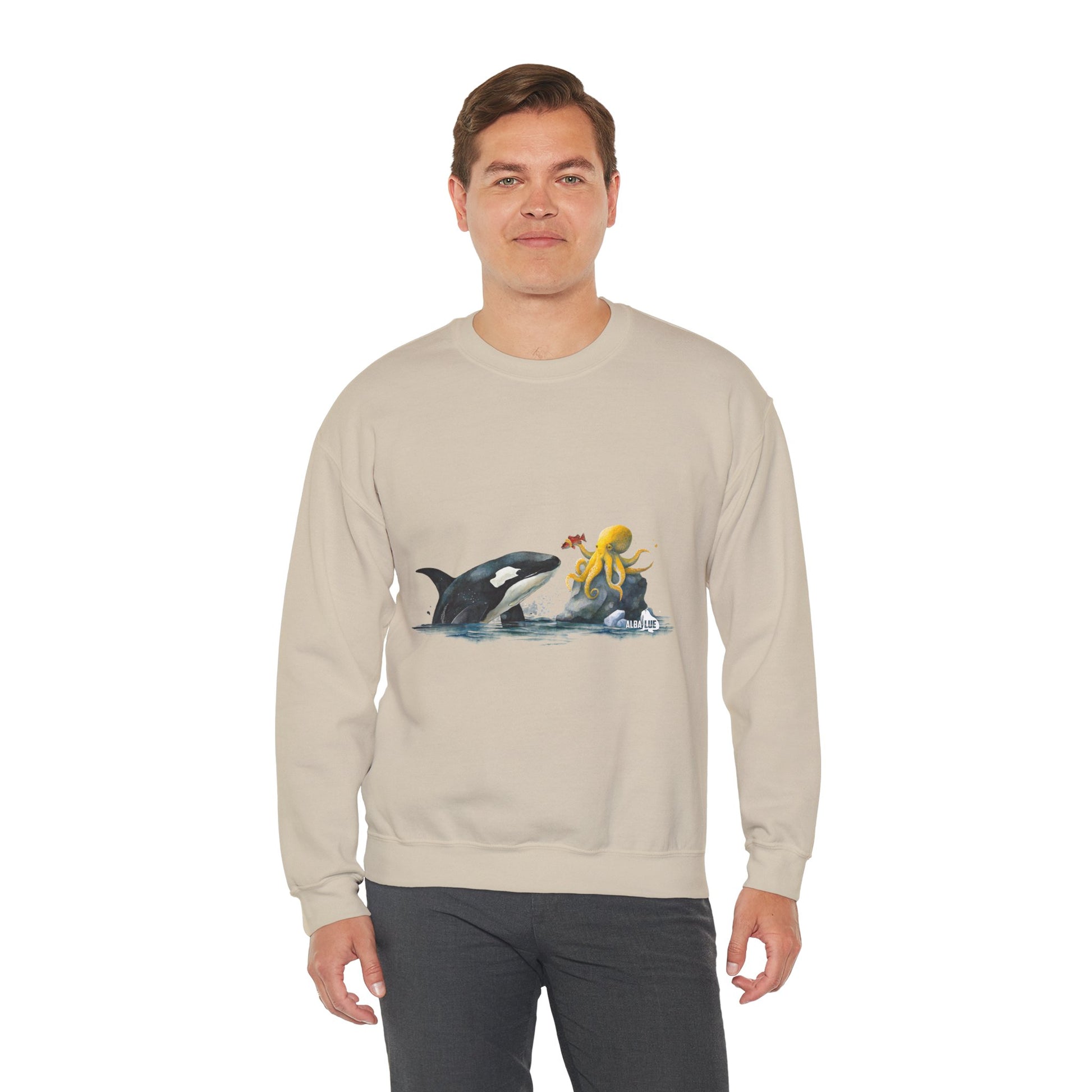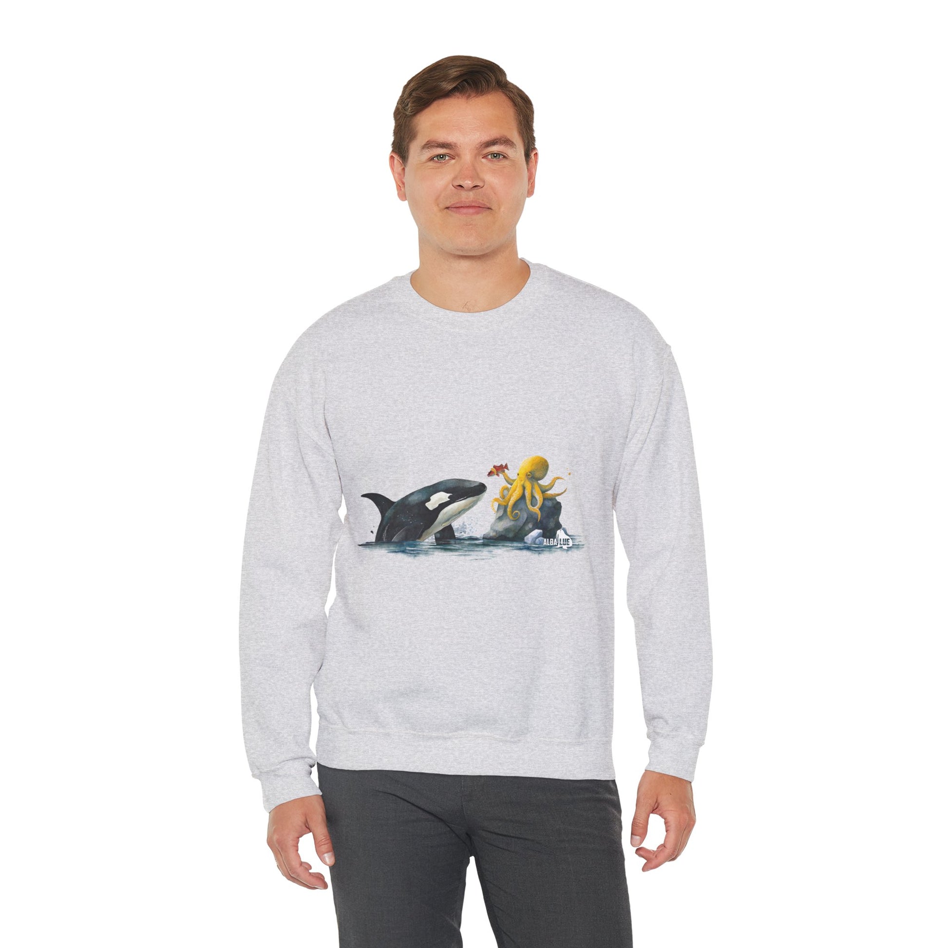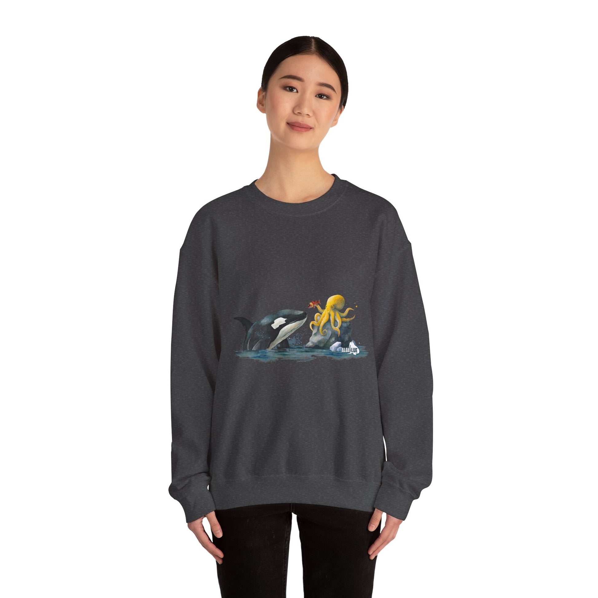 This Sweatshirt featuring an orca playing with an octopus design exudes a playful and whimsical vibe. Perfect for animal lovers, marine life enthusiasts, and those who appreciate unique and eye-catching designs. Ideal for casual wear, lounging at home, or as a statement piece during marine-themed events or animal conservation awareness days.