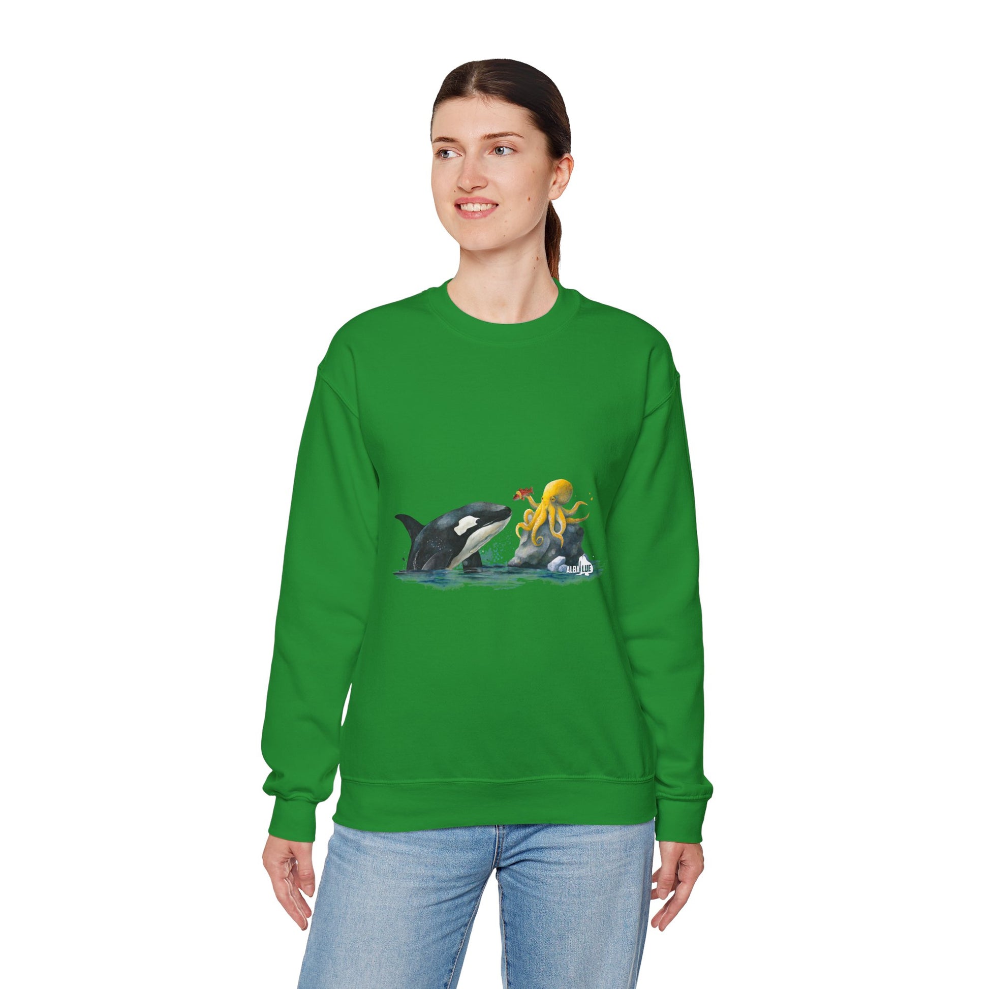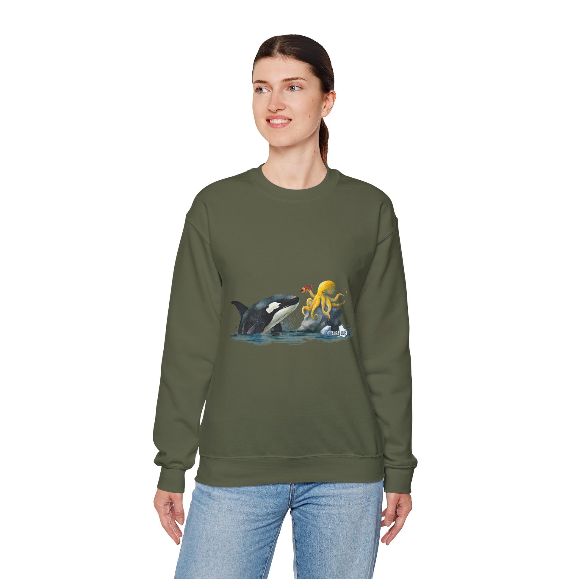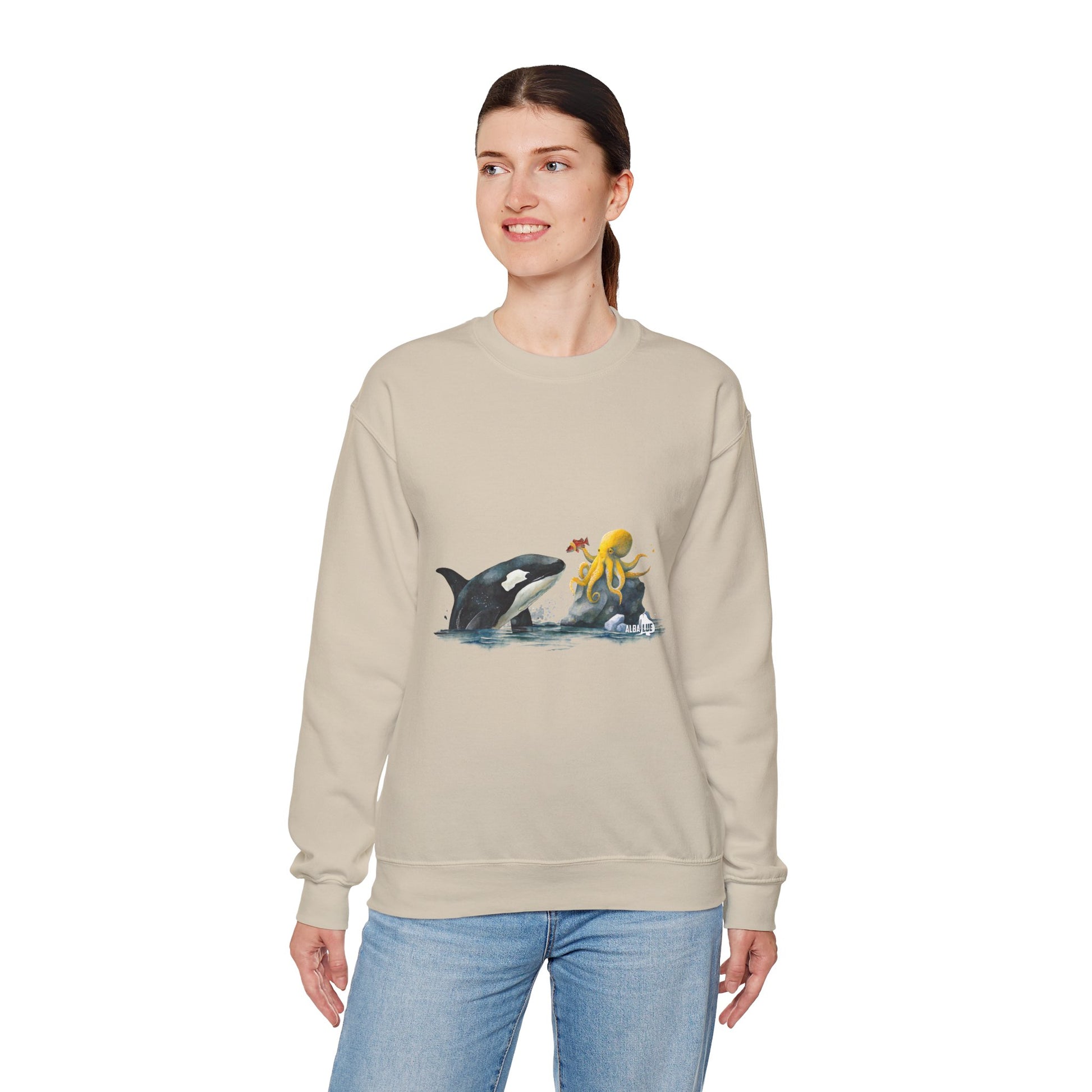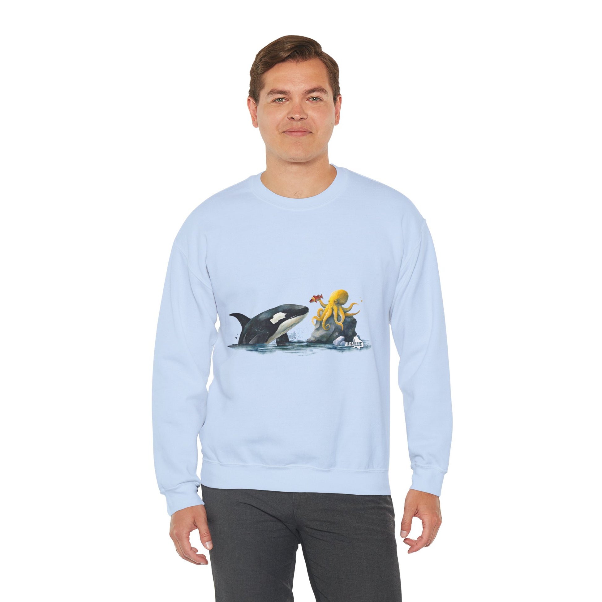 This Sweatshirt featuring an orca playing with an octopus design exudes a playful and whimsical vibe. Perfect for animal lovers, marine life enthusiasts, and those who appreciate unique and eye-catching designs. Ideal for casual wear, lounging at home, or as a statement piece during marine-themed events or animal conservation awareness days.