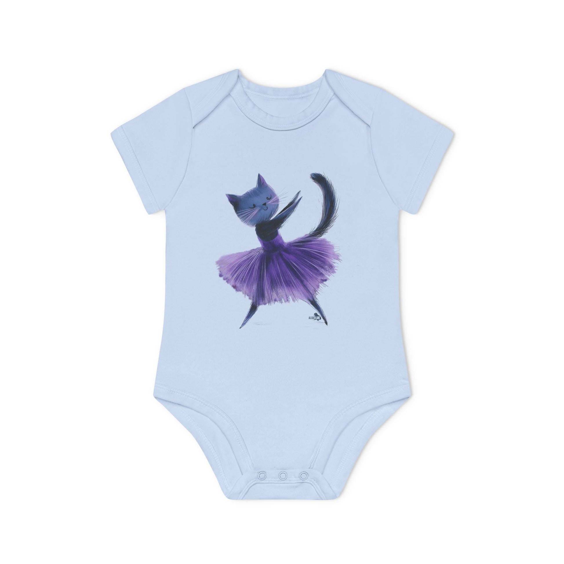 Soft, breathable, and thoughtfully made for tiny movers — this organic baby bodysuit features a delicate illustration of a cat in a purple tutu mid-twirl. The gentle, natural fabric sits smooth against sensitive skin while the envelope neck and snap-bottom make dressing and diaper changes calm and quick. The playful dancer-cat brings a quiet, whimsical charm to everyday wear, turning naps, playtime, and stroller outings into small moments of delight.