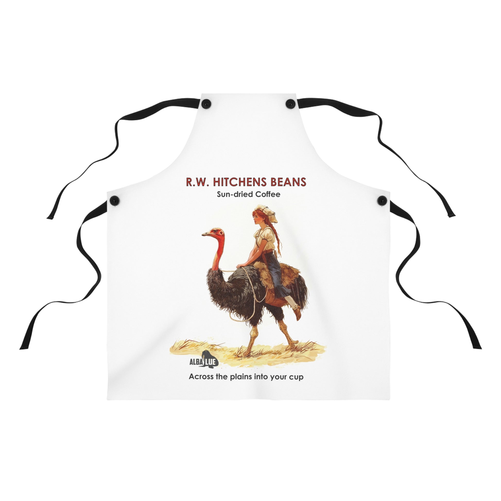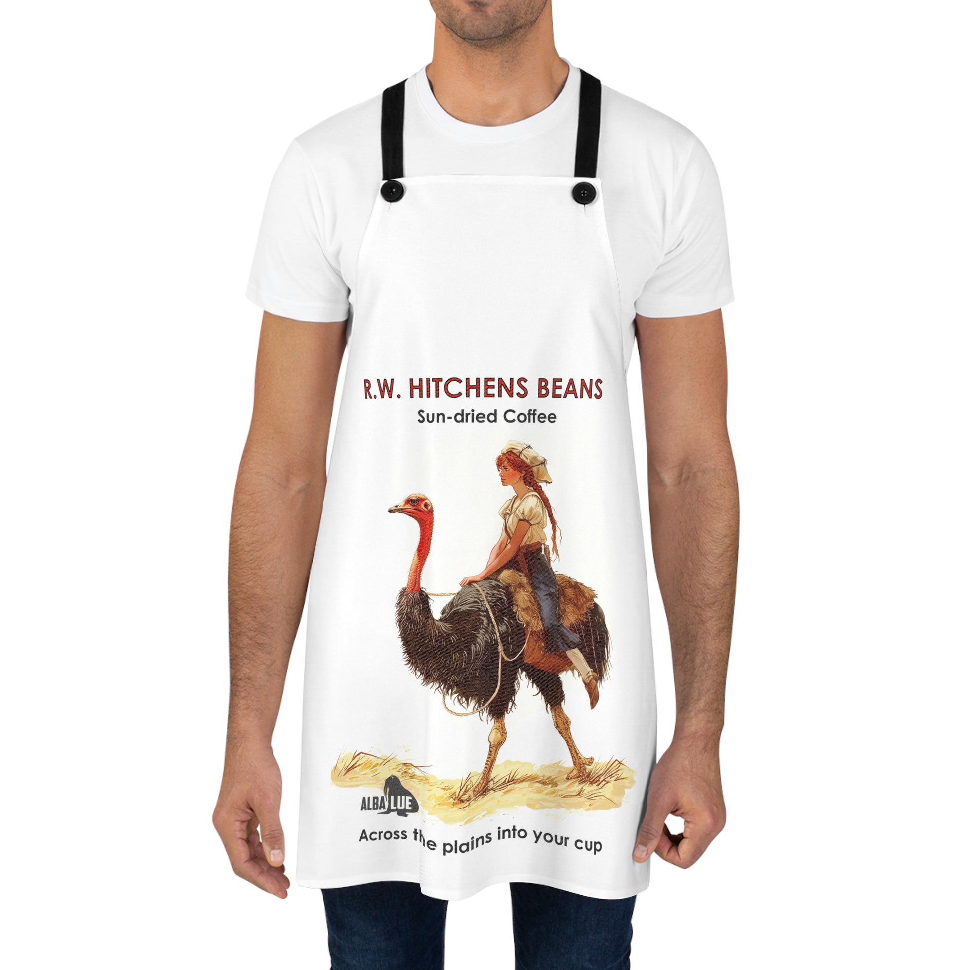 Bring a vintage, storybook charm to your kitchen with this durable printed apron. The artwork — a sunlit scene of a young rider on an ostrich beside the words “R.W. Hitchens Beans — Sun-dried Coffee” — feels like a page from an old trade card, inviting slow mornings and hands-on baking. The crisp white canvas keeps the design bright, while detachable black twill straps and solid overlocked seams stand up to repeated tying, washing, and kitchen bustle. This apron settles into the routine of someone who savors ritual: stirring, roasting, and sharing small moments around the counter or coffee bar. It wears well during weekend baking sessions, coffee tastings, and casual gatherings, adding a nostalgic touch without getting in the way of the work.